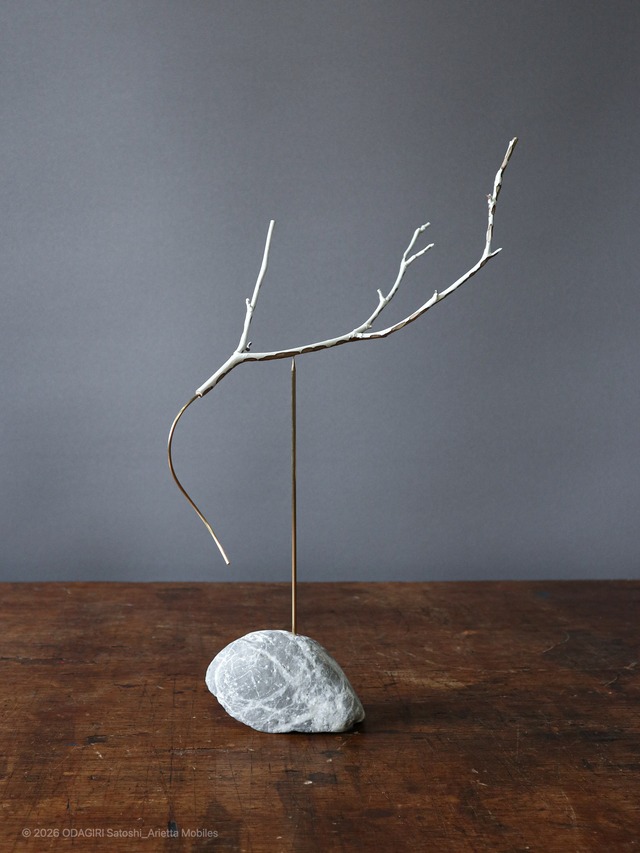 It may seem obvious, but the twigs I encounter every day are all different. There are many different tree species, and even twigs of the same species will have different tendencies depending on where I encounter them. Branches that trees shed at their own rhythm all have parts broken off. Some twigs are imperfect but have good branches, and some have beautiful bark. The broken parts can have a strength, as if they have been weathered by the wind. Just as the sounds of summer rain and winter rain are different, and the sunlight varies each morning depending on the season and the clouds at the time, I discover and collect little by little different beauty from our scenery. 日々出会う小枝は全て異なります。樹種も様々なのですが、同じ樹種の小枝でも出会う場所によって傾向が違います。木が自分のリズムで落とした枝は、どれも枝の一部が折れていたりします。不完全ながら枝ぶりの良いものや、美しい樹皮をもつ小枝。折れた部分の様子が、風にあがなったような力強さを持っていたりもします。夏の雨と冬の雨の音が異なるように、季節とその時の雲によって陽の光が毎朝異なるように、少しづつ違う良さ見つけては拾い集めています。 Here, I repaired the lost branches with brass branches. The curves and length of the brass branches are created by adjusting the overall center of gravity and creating an appearance. I admire Kintsugi, which creates new value by repairing broken vessels. Small new branch that follow the rhythm of the scenery affect the overall balance of the scenery. Here, a small shining brass branch effects the entire weathering branch, and the whole is swaying in the wind. I suppose many people have had the experience of a small realization affecting the way they live their lives. ここでは、失われた枝を真鍮の枝で繕いました。全体の重心を整え、佇まいを作り出す作業から真鍮の枝が持つ曲線や長さは生まれています。私は割れた器を繕うことで新たな価値を生み出してきた金継ぎに憧れます。風景のリズムに則って起こるちいさな芽吹きは、風景のバランス全体に影響を及ぼします。ここでは輝く真鍮の枝が全体に影響を及ぼし、風にそよぐ姿が生まれています。小さな気づきが暮らし方に影響を与えるような経験は、多くの人が持っている体験のようにも思っています。 If we can create new value by reconsidering the balance, I think that would be a hope. I feel that rethinking the balance between cities, regions, economy, and the environment will also create new value. バランスを考え直すことで新たな価値が生み出せるとしたら、それは希望のように思っています。都市や地域、経済と環境のバランスを考え直すこともまた、きっと新たな価値を生み出すと信じています。 I hope that rhythm and balance will lead to harmony. ◆Size Height_330mm Kintsugied Twisted(hidden) Trussed ◆Material Twig ( thoroughly dried and reinforced )_植物 Brass_真鍮 Local stone_川原の石 ◆Type of movement ■ Rotate □ Swing □ Pivot ◆ About price _海外からのご購入時において The payment amount is the total of following. Work+Shipping fee Import duties, related taxes and charges are not included in the work price and shipping fee. These charges at the destination are to be paid by the buyer according to local rules. This varies depending on the country/region and the policies of the carrier are updated from time to time. Please check it yourself if you want accurate information. It would be great if I could inform you about the rules that every country and region has set independently before you make a purchase. However, please understand that it is very difficult to know the respective rules from overseas. I hope that the work reaches you safely and that you are happy when you receive the work.