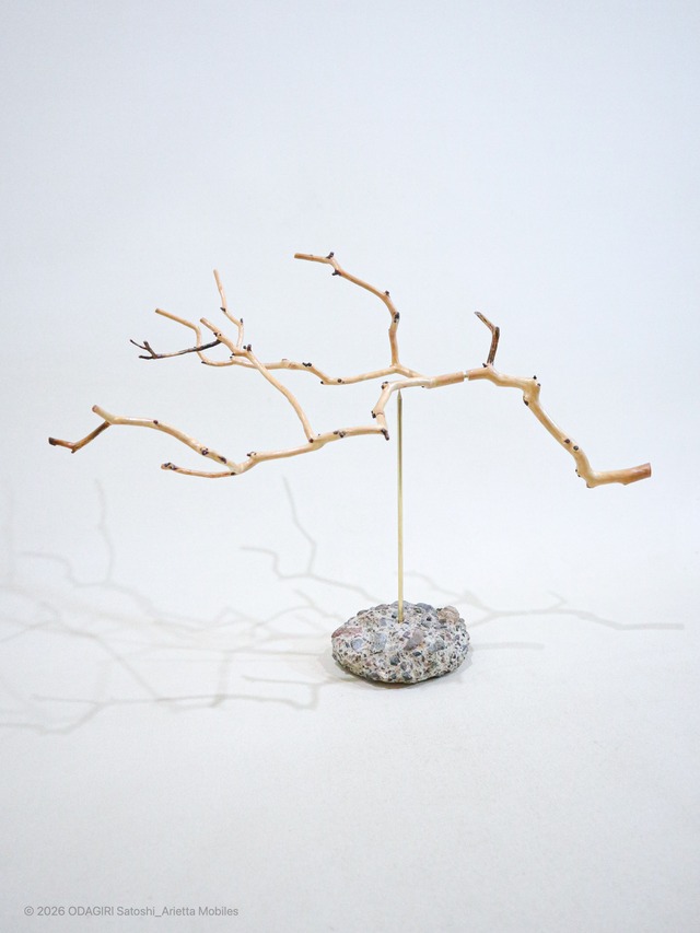 These are fragments of old structures polished by the valley water and twigs dropped by the cherry trees planted along the riverbank. 谷の水が磨いた構造物の欠片と、川岸に植えられた桜が落とした小枝です。 In the mountainous area near Tokyo where my studio is located, villages are dotted along the river that runs through the valley. Our scenery is created by interweaving the trees grown in the mountains for forestry purposes, the garden trees of the villages, and the native plants along the river. 私のスタジオがある東京近郊の中山間地では、谷を流れる川に沿って集落が点在しています。山で林業として育てられる樹木を中心に、集落の庭木と川沿いの自生の植物が織り重なるようにして風景をつくり出しています。 It seems that many of the cherry trees were planted over the last 100 years. The increase in stumps of older cherry trees is inevitable, as trees have a lifespan. Along the riverside nearby, some old structures are decaying, while others are being maintained. 多くの桜はこの100年の間に植えられたものが多いのだそうです。樹齢を重ねた桜の切り株が増えたのは、木にも寿命があるので仕方のない事。 その傍の川辺では、朽ちていくかつての構造物もあれば、手入れされていく構造物もあります。 Our scenery is always changing. There are small_fast rhythms, and slow_large rhythms. If the change is too fast, I feel lonely, and if it is too slow, I feel uneasy. I feel there is an ideal rhythm for things. 風景はいつも変化しています。そこには小さく早いリズムもあれば、ゆっくりとした大きなリズムもあります。変化が早すぎれば寂しく、遅過ぎれば不安を感じるもので。物事にはあるべきリズムがあるのだろうと思っています。 When I see a young cherry tree propped up next to a cherry tree stump, I feel a sense of joy. I'm sure the wild birds that enjoyed the nectar in the spring feel the same way. The magnificent rhythm begins to rotate again, swaying in the wind. 桜の切り株のその傍に、誰かによって添木された桜の幼木を見ると、なんだか嬉しい気持ちになります。春に蜜を楽しんできた野鳥達もきっと同じ気持ちのはずです。大きなリズムがまた風にそよいで回り始めます。 I hope that rhythm and balance will lead to harmony. ◆Size Height_340mm ◆Material Sakura Twig ( thoroughly dried and reinforced )_植物 Brass_真鍮 Fragments of old structures polished by the valley water_古い構造物の欠片 ◆Type of movement ■ Rotate □ Swing □ Pivot ◆ About price _海外からのご購入時において The payment amount is the total of following. Work+Shipping fee Import duties, related taxes and charges are not included in the work price and shipping fee. These charges at the destination are to be paid by the buyer according to local rules. This varies depending on the country/region and the policies of the carrier are updated from time to time. Please check it yourself if you want accurate information. It would be great if I could inform you about the rules that every country and region has set independently before you make a purchase. However, please understand that it is very difficult to know the respective rules from overseas. I hope that the work reaches you safely and that you are happy when you receive the work.