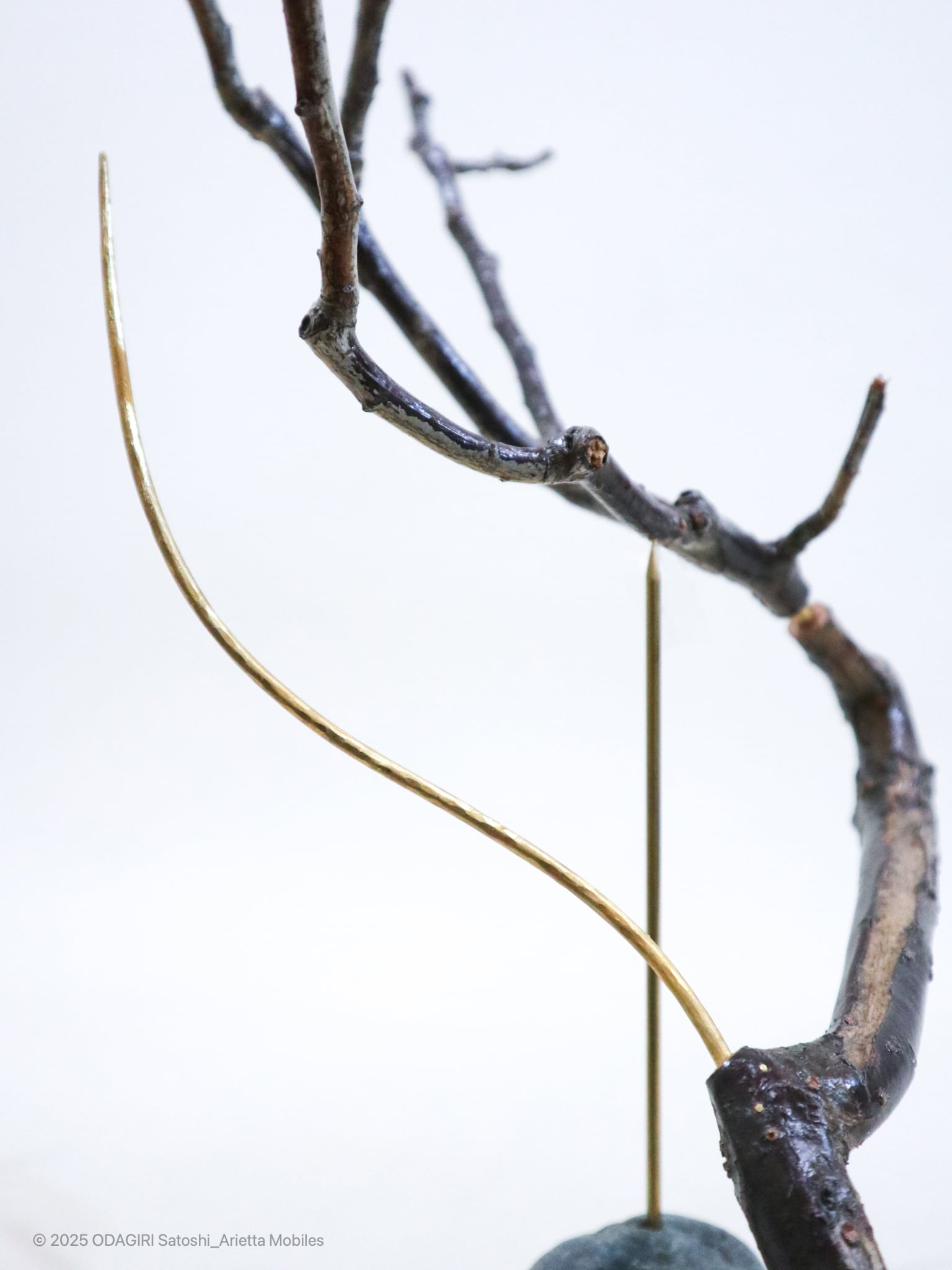I mended branch that were lost in the previous pruning with brass branch. This plum branch must have been pruned since the previous generation, and I can see the different bark shapes that have changed as the branch has grown. The branch must have undulated powerfully every time it was pruned. I added a hinge to one part of it to give it a twist, extending the individuality of the branch.