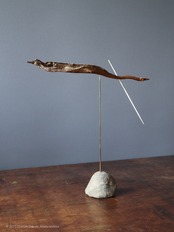 樹木は幹に繋がる枝が折れると、そこから腐朽が始まらないよう幹の内部に防御層を作るそうです。山に落ちている不思議な形の木片や、谷の川に流れる硬い木片は、おそらくこの防御反応によって作られた部分。朽ちずに残っていた硬いこの木片もきっとそのひとつです。風景は見える範囲のリズムをぼんやり眺める私に教えてくれますが、朽ちて土に還るリズムもそれぞれだったようです。この木に何が起きて防御層を作ったのかはわかりませんが、懸命に山の中で立っていたんだろうなと思います。