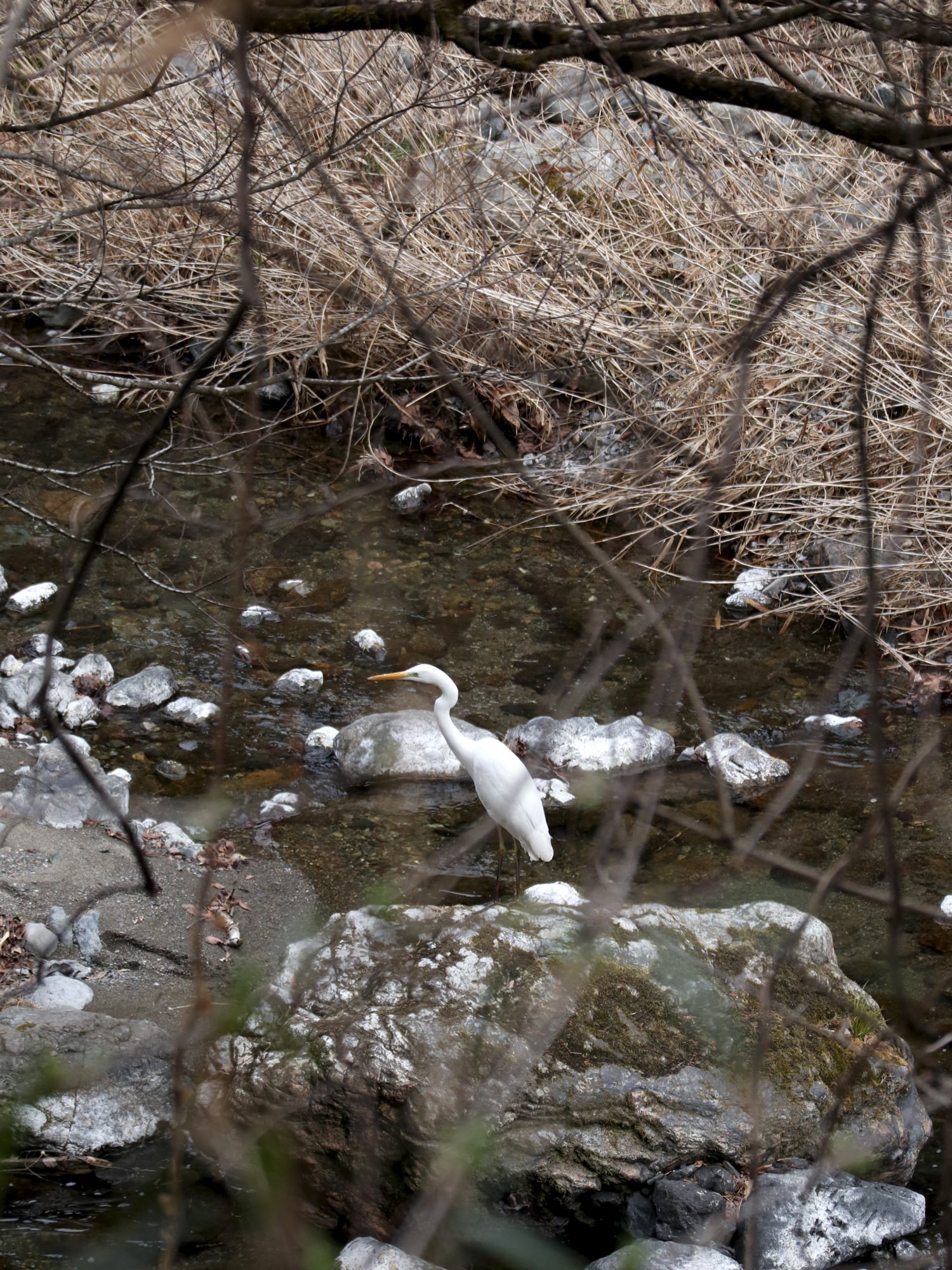 Heron stares at the surface of the river flowing through the valley. It seems like they have a favorite spot to hunt. This shallow area where the limestone that makes up the mountain lines the riverside is one of them. The view overlooking the river from the tree crown is a characteristic sight seen on winter mornings. That there is a river, there are fish to hunt, and there is shallow water to stand on. You can see some of the many conditions they need to live in.