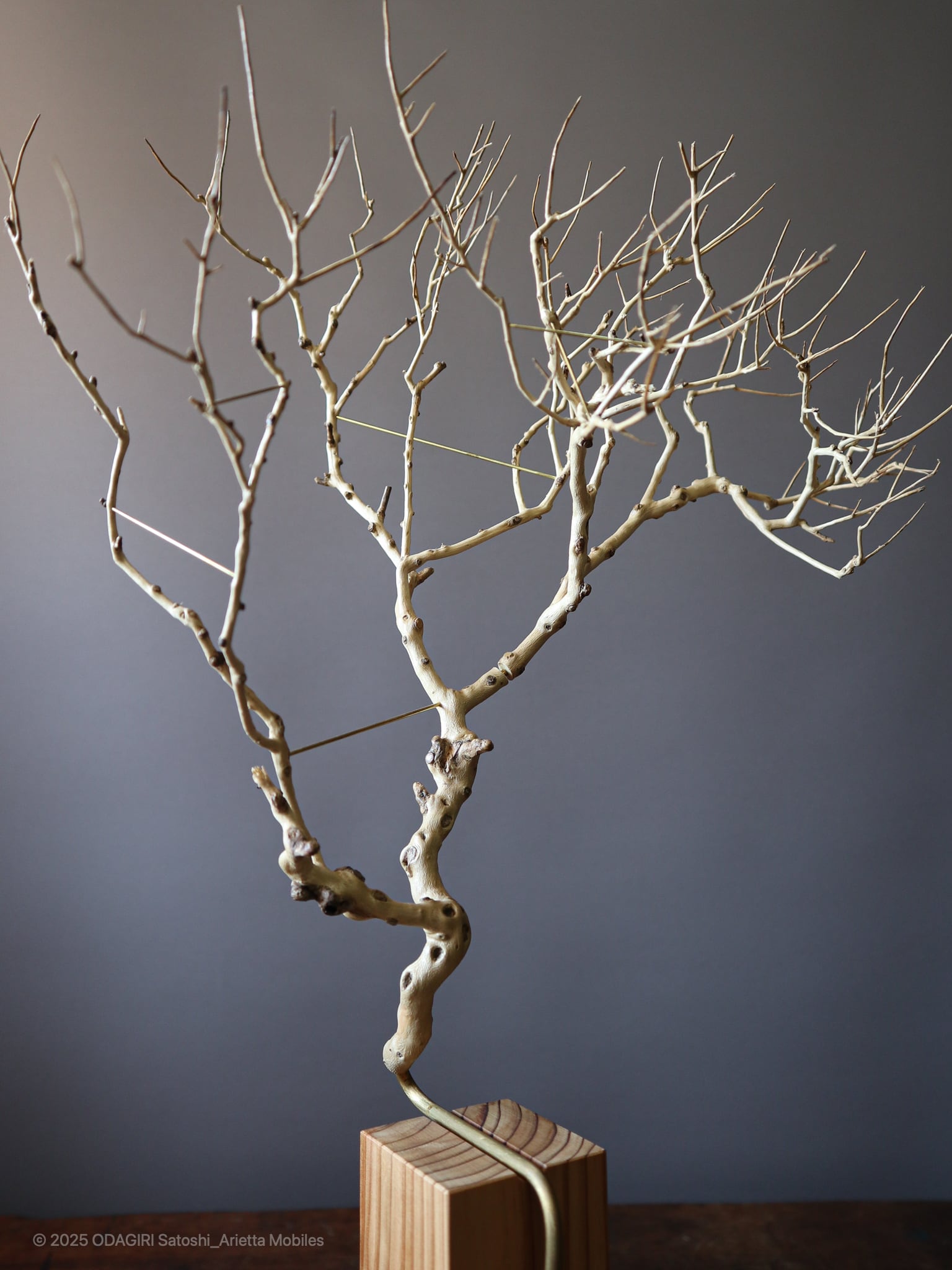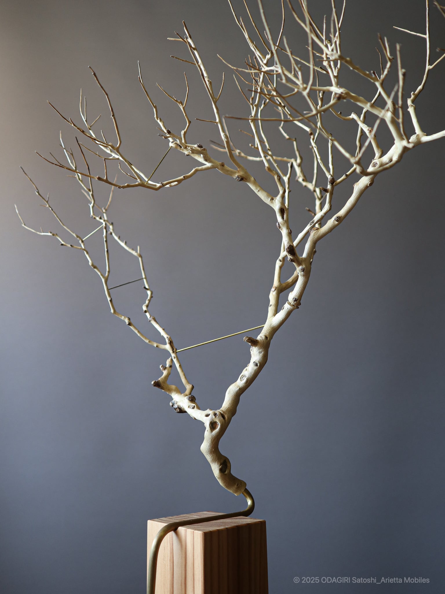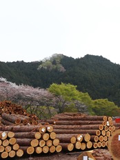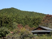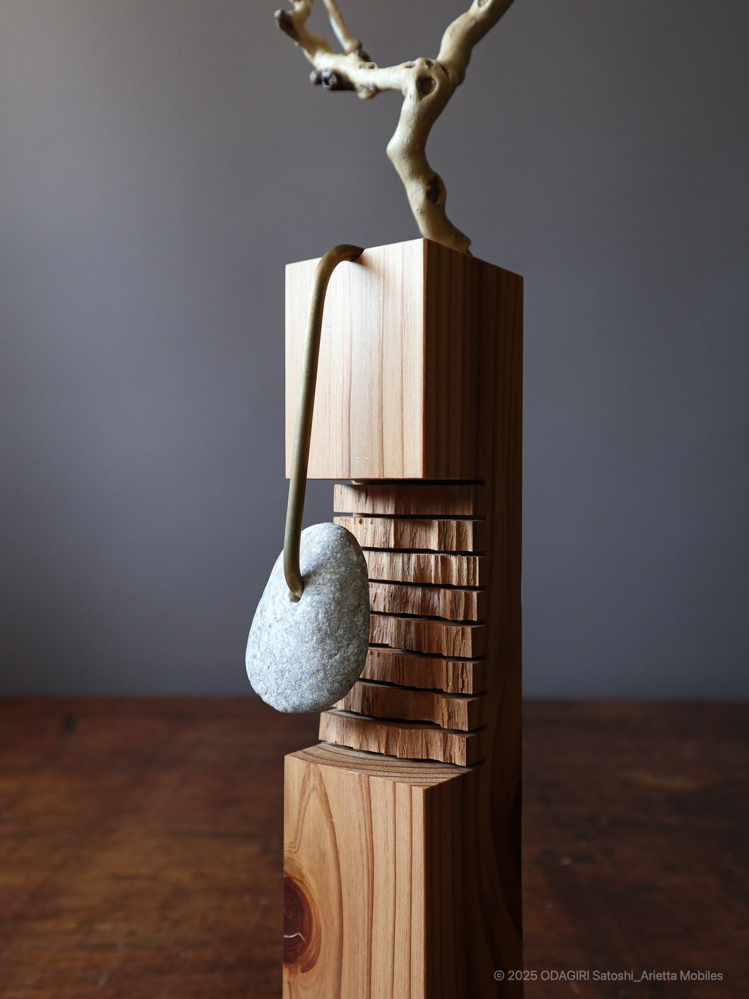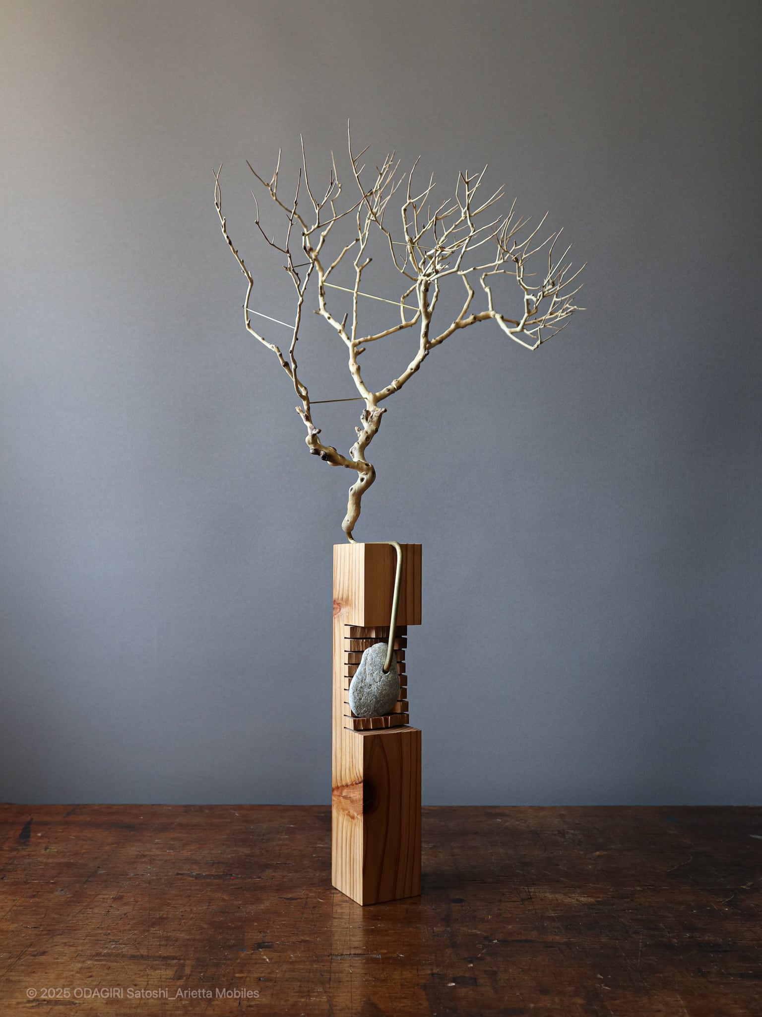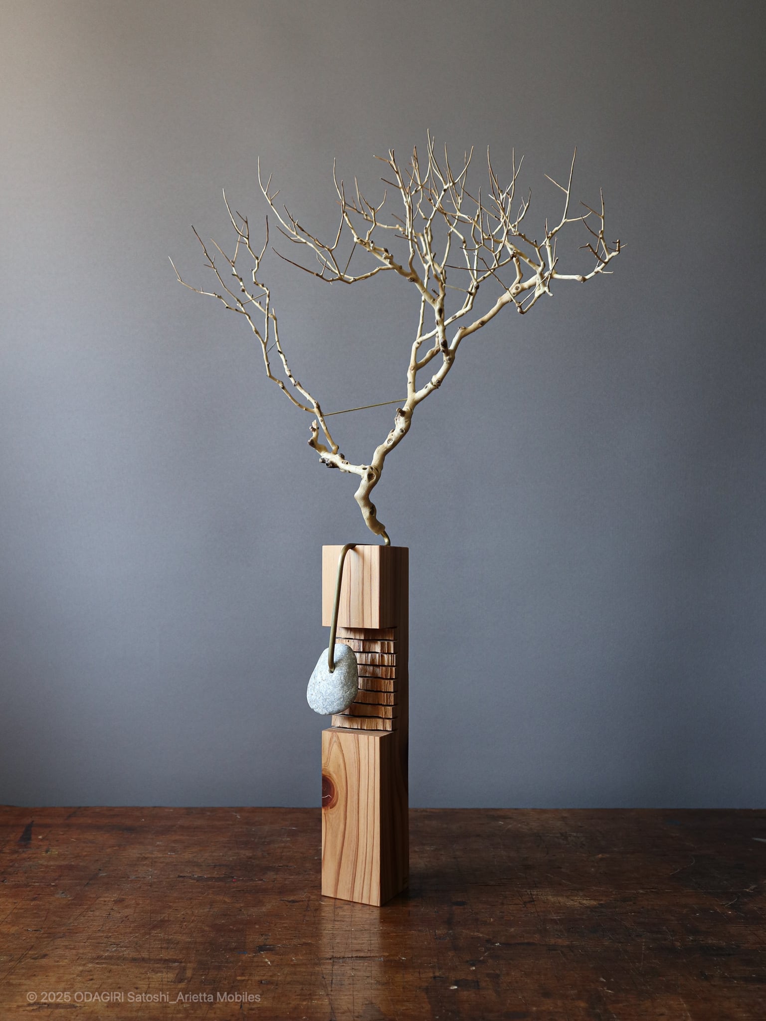 This is an Yamatsuge branch that appeared when a young family started living in the village and tended the garden. The wood is japanese cedar grown in the mountains surrounding the village. It was also used for village buildings, and was a material that created the townscapes of the Edo.The stones are pebbles from the riverside in the village valley, polished by the river water. They are limestone that represents a small feature of this area, downstream of Mount Buko where lime has been extracted.