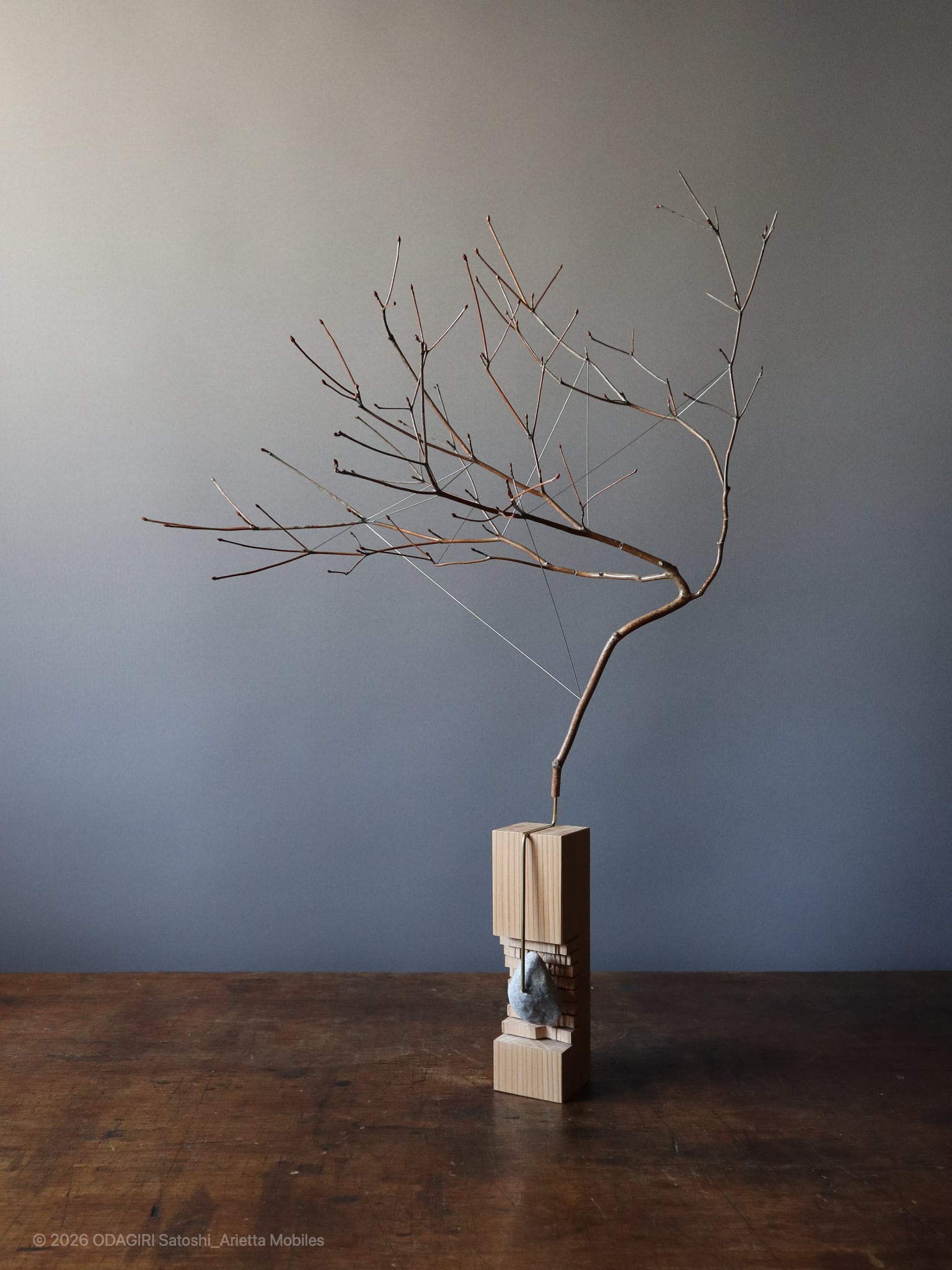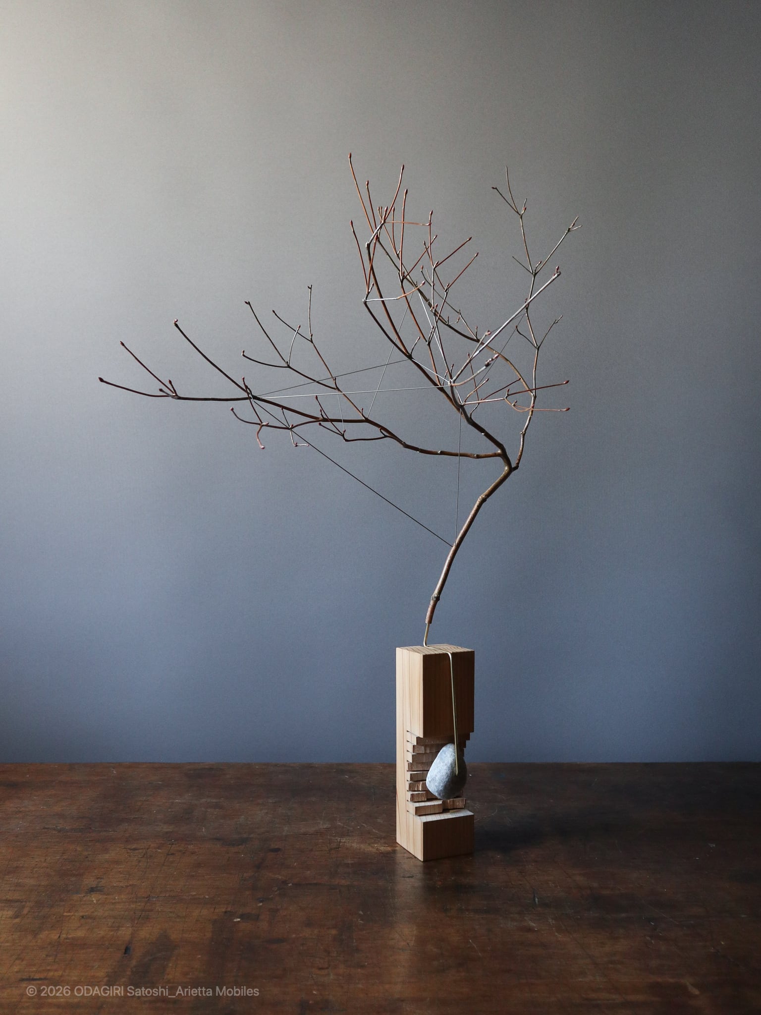 This is D_azalea branch that was pruned during local maintenance work.The wood is Japanese cedar grown in the mountains surrounding the village. It was also used for village buildings, and was a material that created the townscapes of the Edo.The stones are pebbles from the riverside in the village valley, polished by the river water. They are limestone that represents a small feature of this area, downstream of Mount Buko where lime has been extracted.